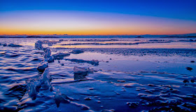 | En janauar morgen med minus 12 grader sitter vi i kajakkene våre utenfor Odderøya og venter på soloppgangen. når det kommer drivende et isflak kan kameraet settes på det for å ta dette bildet. |