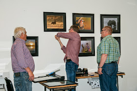 Annette W. Høyland og Terje Alveberg henger opp bilder, mens Solfrid Røinås, Tom L. Larsen, Frode Aaberg (Japan Photo), og Tore Moy følger med på at alt går riktig for seg ;-)